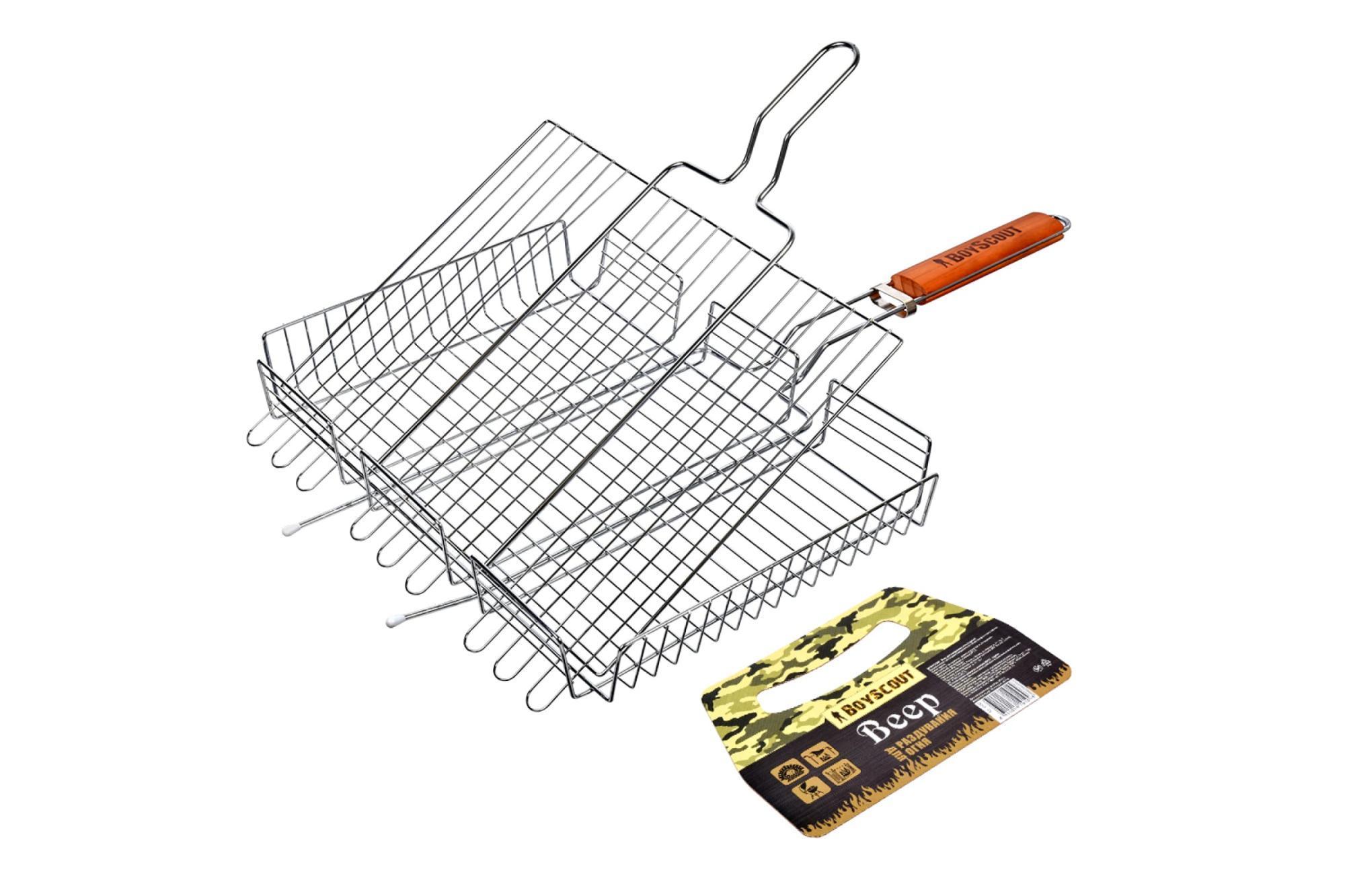 Большая объемная решетка-гриль 42х32 с регулируемой высотой (от 0,5 до 5,5 см) дает возможность готовить на решетке как тонкие, так и крупные куски продуктов. Изготовлена решетка для гриля из высококачественной стали с пищевым хромированным антипригарным покрытием, эргономичной ручки из дерева практически не нагревающейся, благодаря чему является комфортной и безопасной для рук. Плотное фиксирующее кольцо исключает риск случайного раскрытия изделия во время приготовления пищи. Решетка барбекю в отличие от шампуров универсальна и подходит не только для мяса, рыбы, бифштексов, курицы, но и для сарделек, сосисок, овощей и прочего.