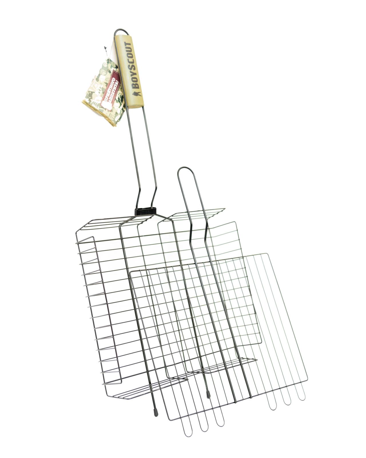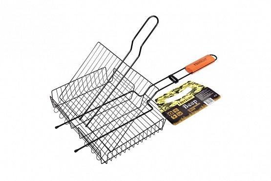 Решетка-гриль предназначена для приготовления мяса, рыбы, курицы, овощей на открытом огне. Решетка барбекю изготовлена из высококачественной стали и имеет антипригарное покрытие, дополнена деревянной ручкой с фиксирующим кольцом для надежной фиксации верхней створки решетки. Деревянная рукоятка позволяет держать решетку без риска получить ожог. Размер рабочей поверхности 30х25 см. В подарок прилагается картонный веер. Для очистки решетки, не использовать абразивные чистящие средства или грубые предметы, чтобы не повредить антипригарное покрытие.