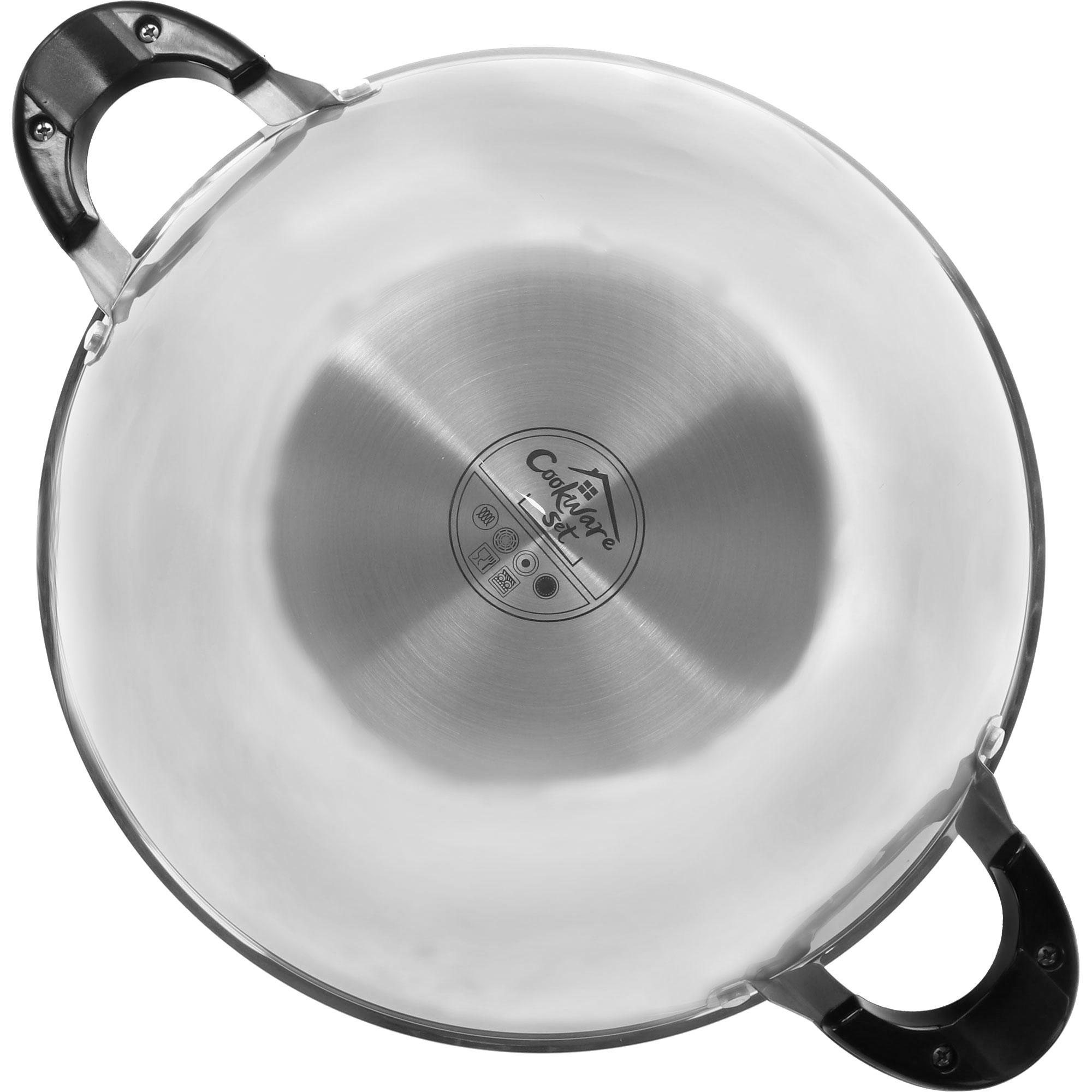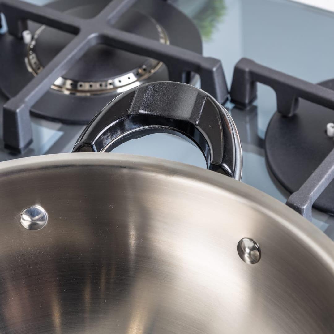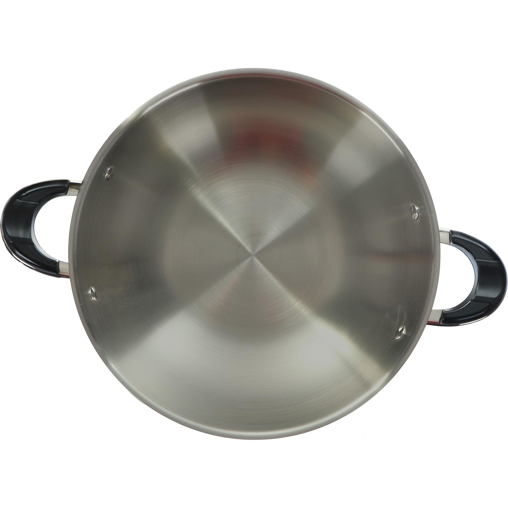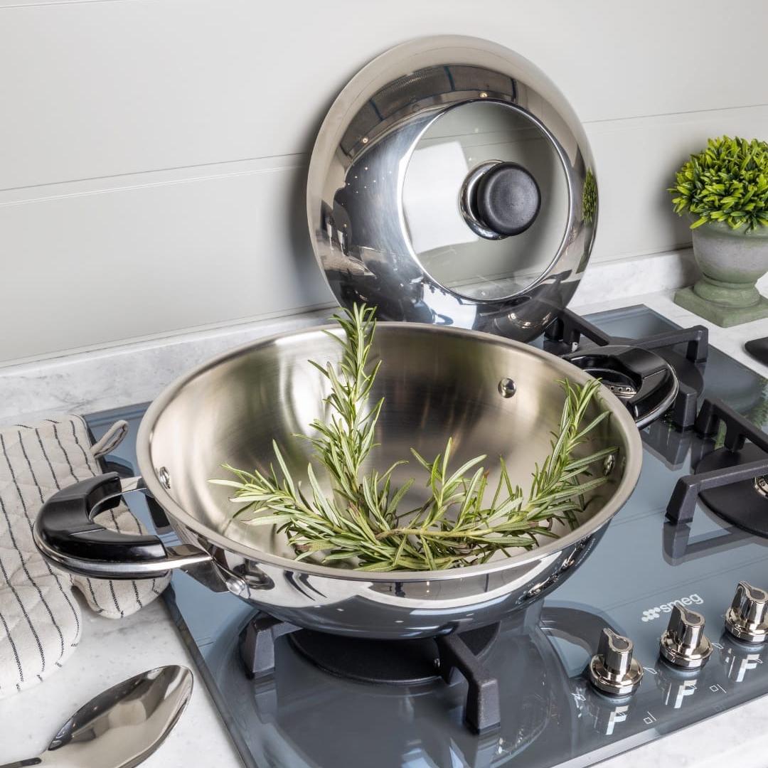 Вок бренда Vantage изготовлен из нержавеющей стали, благодаря чему, несмотря на высокий уровень прочности и долговечности, он легок и не требует особого ухода. Трехслойные толстые стенки и дно с внутренней прослойкой из алюминия гарантируют отсутствие деформации и сильного перегрева. Стальная крышка со стеклянной вставкой и пластиковые держатели в ручках добавляют эргономичности и удобства во время готовки.