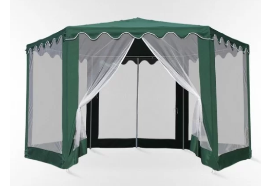 Садовый шатер с антимоскитной сеткой, выполненный из полиэстера, имеющий стальной каркас. Подходит для размещения на даче, во время отдыха на природе.