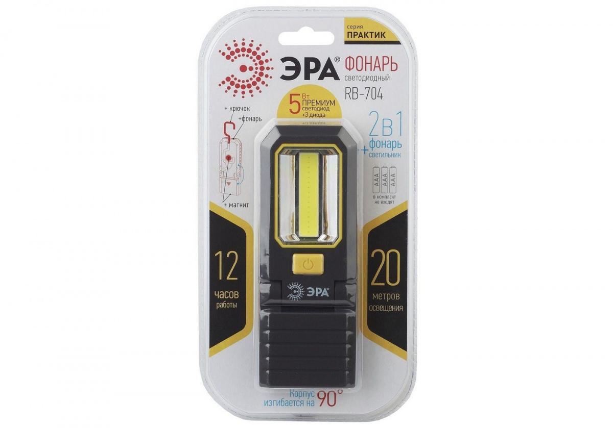 Кемпинговый светодиодный фонарь ЭРА RB-704 Практик 5Вт COB 3xLED 3xAAA крючок 2 магнита Б0029179 - многофункциональный светодиодный фонарь с режимом светильника и двумя типами крепления. Корпус сгибается в двух направлениях (по 90 градусов каждое). На торце - мощный магнит. Дополнительный магнит расположен на задней стороне фонаря. Имеется удобный прочный крючок. Закрепив фонарь на нужной поверхности, можно быстро настроить необходимый для работы угол освещения. Переключение режима превращает фонарь в светильник с ближним заливающим светом. Фонарь незаменим как при профессиональных работах (строительство, ремонт, монтаж, обслуживание), так и в частном использовании (работы в доме, на приусадебном участке, путешествия). Покрытие корпуса - софт-тач (мягкое, приятное на ощупь, без скольжения). Основной режим освещения - яркая LED-плата СОВ (5 Вт). Сопутствующий - 3 диода на торце с направленным лучом длиной до 20 метров.