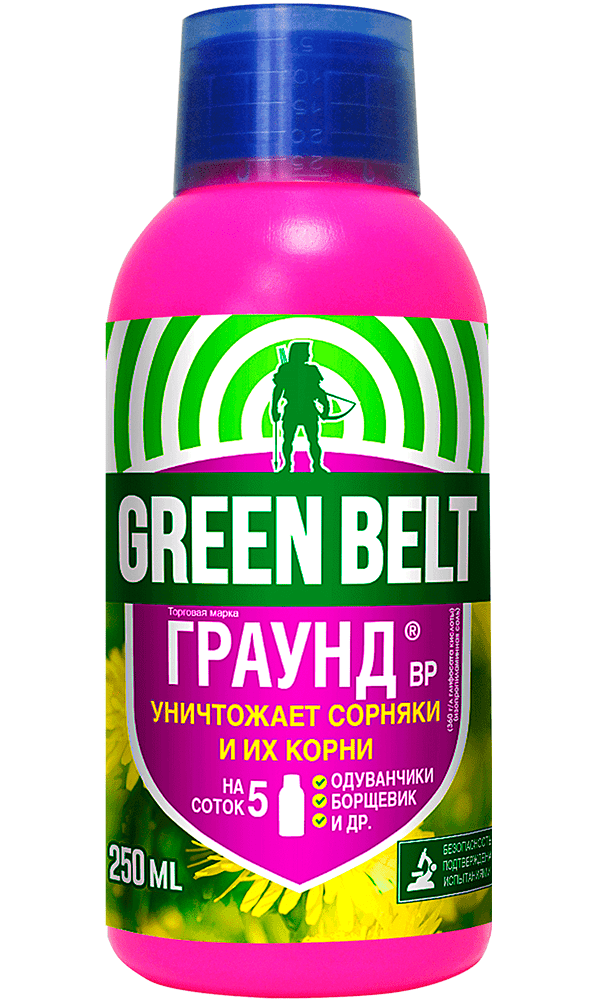 Средство для защиты от сорняков Грин Бэлт Граунд 250 мл 01-235 используется для борьбы с одуванчиком, борщевиком и другими сорняками. Уничтожает растение целиком, вместе с наземными и подземными побегами. Сорняк отмирает через 15-25 дней после обработки.