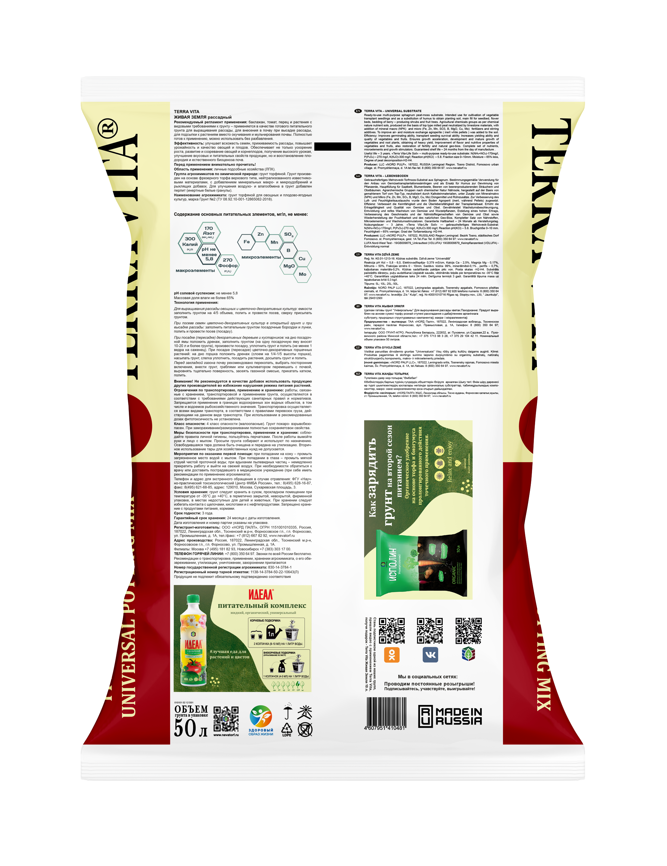 Грунт Terra Vita Живая Земля универсальный 50 л - полностью готовый питательный грунт, применяется для выращивания всех видов овощных, ягодных культур, цветов и рассады. Улучшает всхожесть семян, приживаемость рассады. Повышает урожайность и качество овощей и плодов. Обеспечивает ускорение роста, развития и созревания овощей и корнеплодов, получение высокого урожая. Улучшает вкусовые и питательные свойства продукции. Восстанавливает плодородие и естественный биоценоз почв.