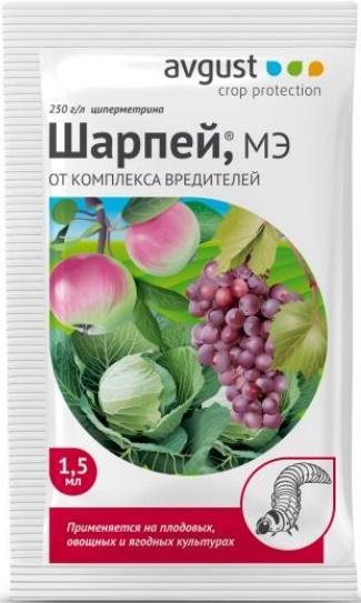 Ампула от вредителей на плодовых деревьях Avgust Шарпей, МЭ 1.5 мл A00276 применяется для борьбы с широким спектром насекомых на картофеле, капусте, винограде и других растениях. Препарат обладает быстрым действием, поражает нервную систему вредных насекомых. В зависимости от вида вредителя, стадии его развития и погодных условий период защитного действия составляет от 7 до 14 дней. Действующее вещество: 250 г/л циперметрина.
