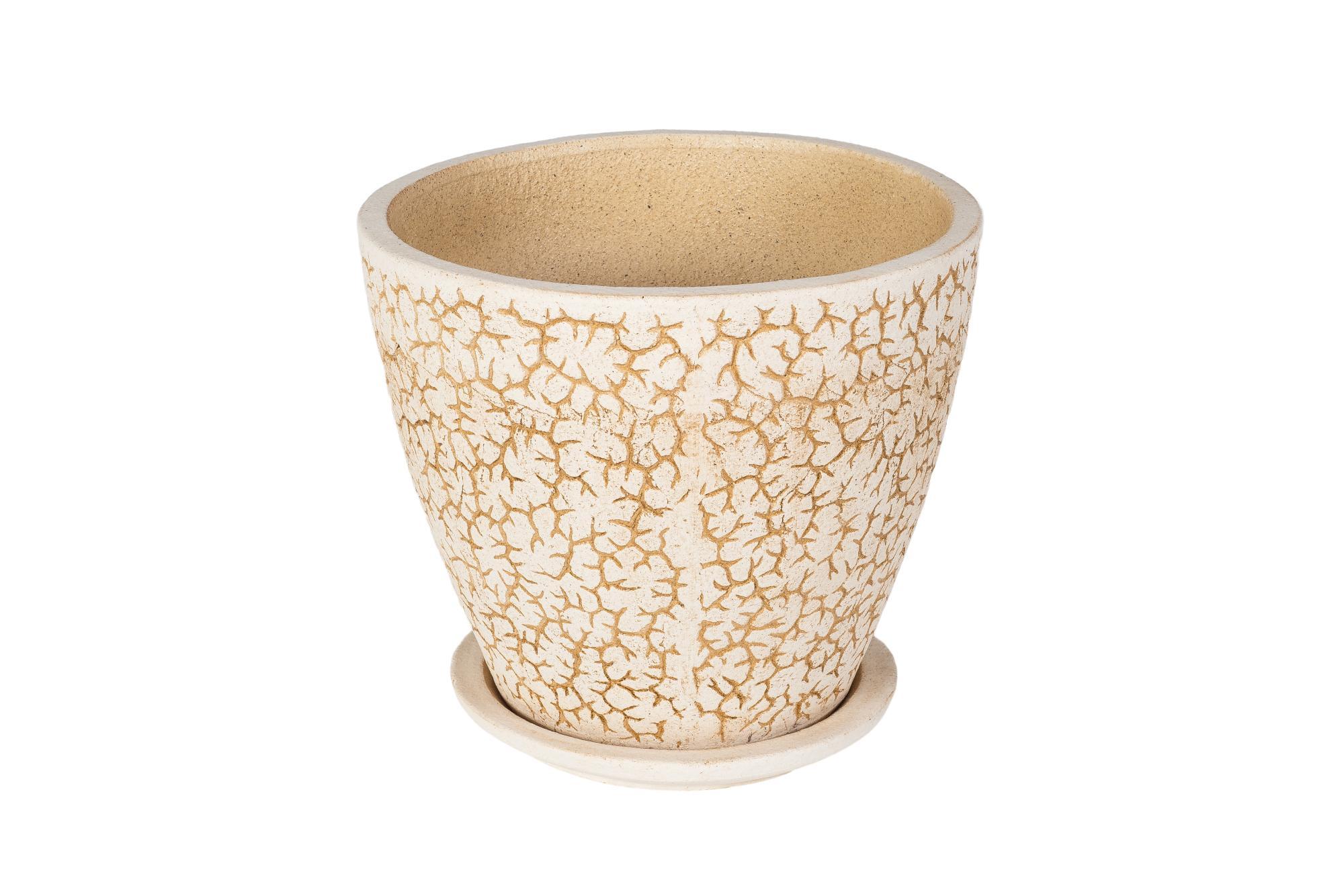 Цветочный горшок изготовлен из шамотной глины высокотемпературного обжига. Изнутри покрыт специальной кварцевой глазурью. Выполнен в бежевом цвете с тёмно коричневыми трещинками. Декорирован узорами из линий, имитирующими растрескавшуюся поверхность. Горшок по форме напоминает перевёрнутый усечённый конус, имеющий выпуклые стенки.