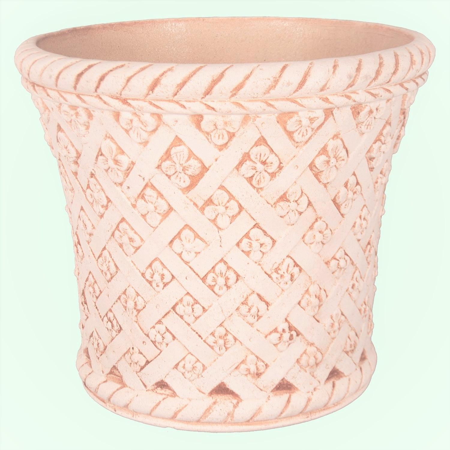 Цветочный горшок изготовлен из шамотной глины высокотемпературного обжига. Изнутри покрыт специальной кварцевой глазурью. Выполнен в бежевом цвете с оттенками коричневого на узорах. Декорирован объёмным ромбовидным плетением с цветами, сверху и снизу горшка в виде ободка расположен объёмный жгут. Горшок по форме напоминает классический горшок чуть расширяющийся в верхней части. Преимущества: Экологически чистый материал, не содержит вредных примесей Горшки обладают высоким сроком службы, более 10 лет Подходит для посадки любых растений Не протекает, не гниет и не болеет грибком Благоприятен для роста и развития растений Подходит для использования в помещениях и на улице Эстетически вписывается в любой интерьер, дополняя растение Описание Горшок керамический Валентин выполнен в виде классического горшка с интересным декором.