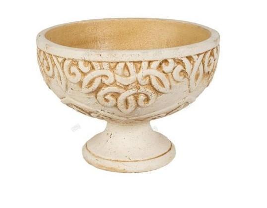 Вазон для сада изготовлен из шамотной глины высокотемпературного обжига. Изнутри покрыт специальной кварцевой глазурью. Выполнен в бежевом цвете с коричневым в области декора. Декорирован узорами из линий, имитирующими лёгкие трещинки под старину и рельефными восточными орнаментами по поверхности чаши вазона. Керамика по форме напоминает большую чашу - кубок на ножке.