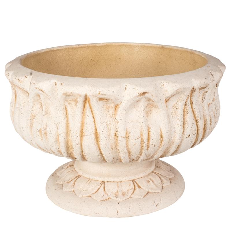 Керамический вазон для сада «Крокус большой» выполнен в бежевом цвете с добавлением коричневого цвета в области декора, имеет форму большой круглой, слегка сжатой чаши. Устойчивая круглая ножка вазона украшена узором из листьев. Керамический вазон Крокус оригинально украсит собой любое помещение кафе, гостиницы, административного здания и, конечно же, ландшафтный дизайн загородного дома. Растения, посаженные в вазон из шамотной глины, благоприятно растут и развиваются, так как находятся в комфортных условиях. Это достигается за счет микропор в стенках керамики, они пропускают кислород и пары влаги, создавая тем самым наилучшие условия для растений.