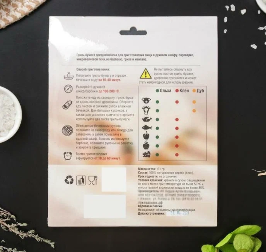 Гриль-бумага позволяет готовить ароматные блюда в духовом шкафу, на мангале или барбекю, а также в пароварке и микроволновой печи в любое время года. Сначала еда насыщается паром, затем гриль-бумага медленно тлеет, насыщает дымком и не даёт пище пригореть снизу. Как использовать гриль-бумагуПогрузите гриль-бумагу и кусок бечёвки в воду на 10–40 минут. Разогрейте духовой шкаф/барбекю до 160–200 °C. Положите еду на середину гриль-бумаги вдоль волокон древесины. Оберните пищу листом и завяжите влажной бечёвкой. Для больших кусочков, а также для усиления аромата дымка, используйте 2 листа гриль-бумаги. Обвязанные рулоны положите на металлический поддон, сковороду или форму для запекания, а затем поместите в духовой шкаф. Если вы используете барбекю, поместите рулоны на решётку и закройте крышкой. Время приготовления варьируется от 10 до 60 минут. Внимание! Не рекомендуется заворачивать еду в сухой лист гриль-бумаги, т. к. древесина трескается и может стать непригодной для использования.
