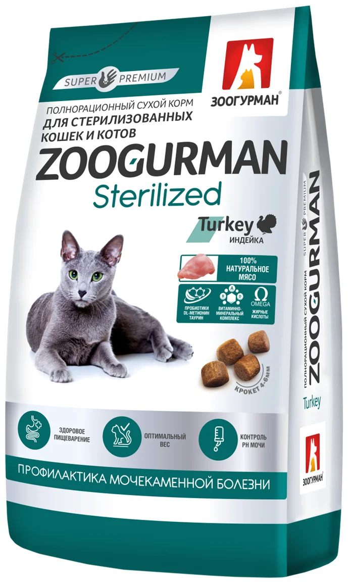 Сухой корм для взрослых кошек ЗООГУРМАН Sterilized с индейкой – это профилактика мочекаменной болезни, здоровое пищеварение, оптимальный вес и контроль PH мочи.