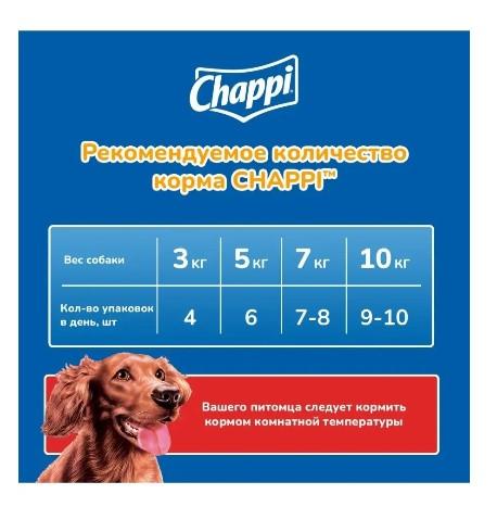 Корм для собак CHAPPI - это вкусный мясной обед, который обязательно понравится Вашей собаке. Он оптимально сбалансирован и содержит все необходимое для того, чтобы поддерживать здоровье и хорошее самочувствие Вашего любимца. Рекомендуемое количество корма CHAPPI вес животного, кг - упаковок корма в сутки, шт: 3 кг - 4; 5 кг - 6; 7 кг - 7-8; 10 кг - 9-10. Вашего питомца следует кормить кормом комнатной температуры.