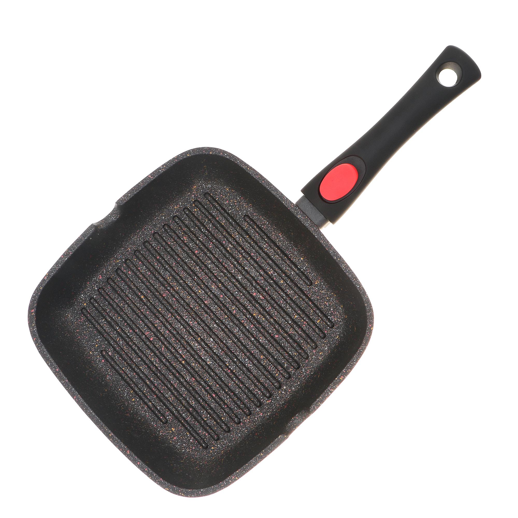Сковорода-гриль - это необходимый предмет на кухне для здорового питания. Сковорода выполнена из прочного и легкого алюминия. Ненагревающаяся ручка – из приятного на ощупь бакелита. Мраморное антипригарное покрытие наивысшего качества не позволит еде пригореть даже без использования масла. Сковороду легко чистить и хранить, она подходит для многих типов кухонных плит, в том числе индукционных плит. Сковорода гриль с антипригарным покрытием высчего качества имеет съемную ручку для удобства готовки.