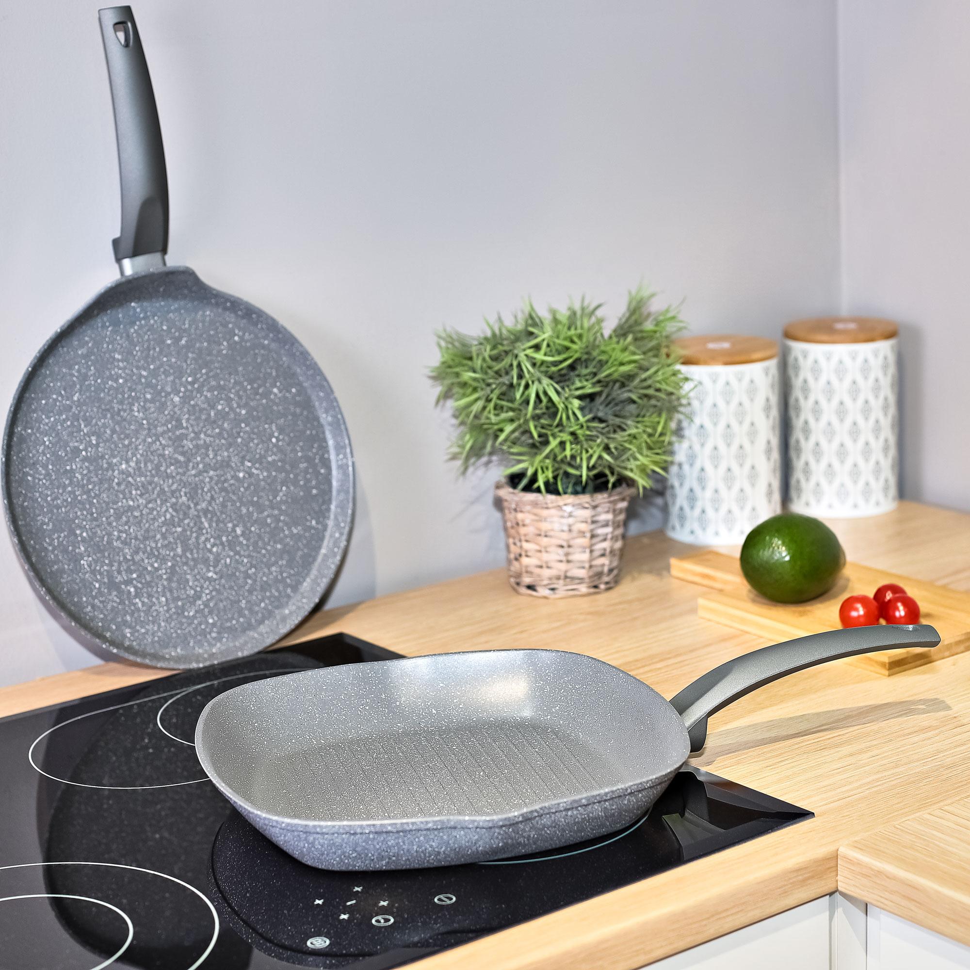 Сковорода изготовлена из прочного алюминия с каменным антипригарным покрытием внутри и снаружи. Это долговечное покрытие обладает высокой стойкостью к царапинам и отличной теплопроводностью. Мягкие ручки выполнены из бакелита — жаропрочного материала, который точно не поплавится и не деформируется во время готовки. Посуда подходит для большинства кухонных плит.