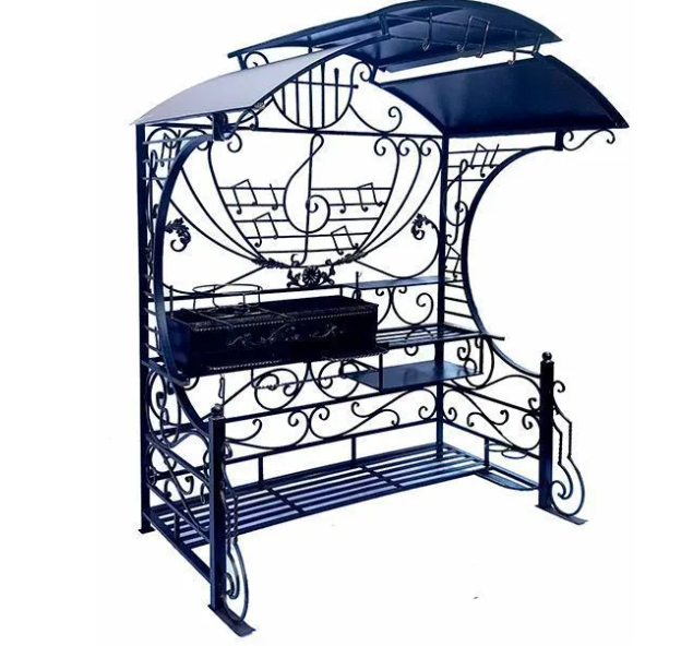 Изделие укомплектовано колчаном для шампуров, коваными подвесными лампадами и подставками под бутыли.
