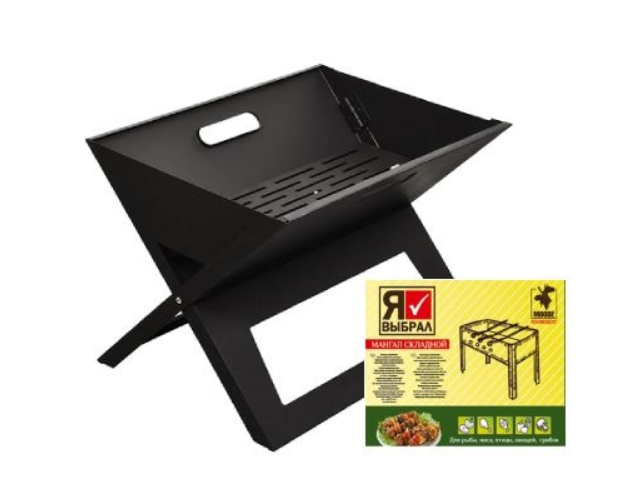 Мангал складной. Длина-460 мм, ширина-340 мм, высота-320 мм, толщина металла-0,8 мм. Сложенный 46х46х3 см, вес-4 кг.