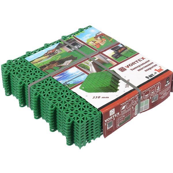 Пластиковое покрытие укладывается на любую ровную поверхность (допускается ее изношенность и наличие мелких дефектов). Устанавливается и удаляется без применения инструментов. Каждый модуль скрепляется между собой , благодаря этому покрытие получается единым целым и равномерно принимает нагрузку. Пластиковые плиты - это самое распространенное решение для площадки перед домом, для беседок, для зоны отдыха, автомобильных стоянок, пешеходных дорожек, спортивных площадок, игровых и парковых зон, полей для гольфа, теннисных кортов, экопарковок и т. д. Пластиковое покрытие возможно использование внутри и вне помещений. В помещении уборка производится с применением пылесоса. Покрытие, установленное вне помещений, легко промыть водой при помощи шланга. При укладке покрытия на грунт см. инструкцию на упаковке. Размер одной плитки 33 см х 33 см х 1 см. В комплекте 9 плиток.