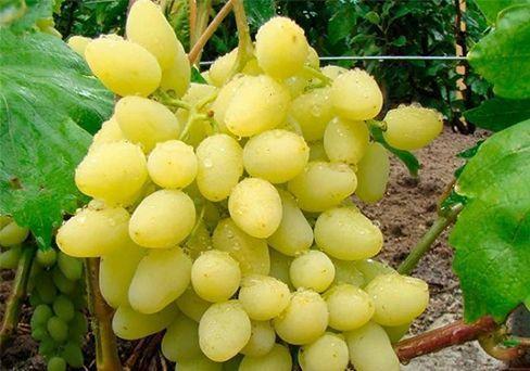 Виноград Долгожданный – гибрид раннего срока созревания. Кусты высокие, с мощной лозой и большими темно-зелеными листьями. Отличительная особенность сорта – наличие бессемянных ягод наряду с семенными. Крупная, конической формы гроздь формируется сосковидными виноградинками белого цвета. Вес спелой кисти от 500 до 800 грамм. Наполнение свободное, немного рыхлое. Вкус кисло-сладкий, гармоничный. Назначение – столовое.