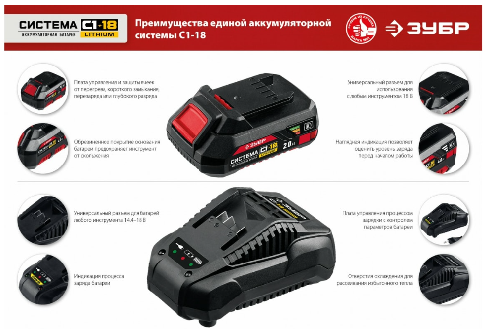 Аккумуляторная батарея ЗУБР АКБ-С1-18-2 предназначена для обеспечения питания аккумуляторного инструмента. Подходит для инструментов: ДШЛ-185, ДШЛ-185-22, ДШУ-185, ДШУ-185-22, ДШБ-185, ДШБ-185-22, ГУЛ-255, ГУЛ-255-41, ГУЛ-410, ГУЛ-410-41, СПЛ-185, СПЛ-185-41, ТА-185.