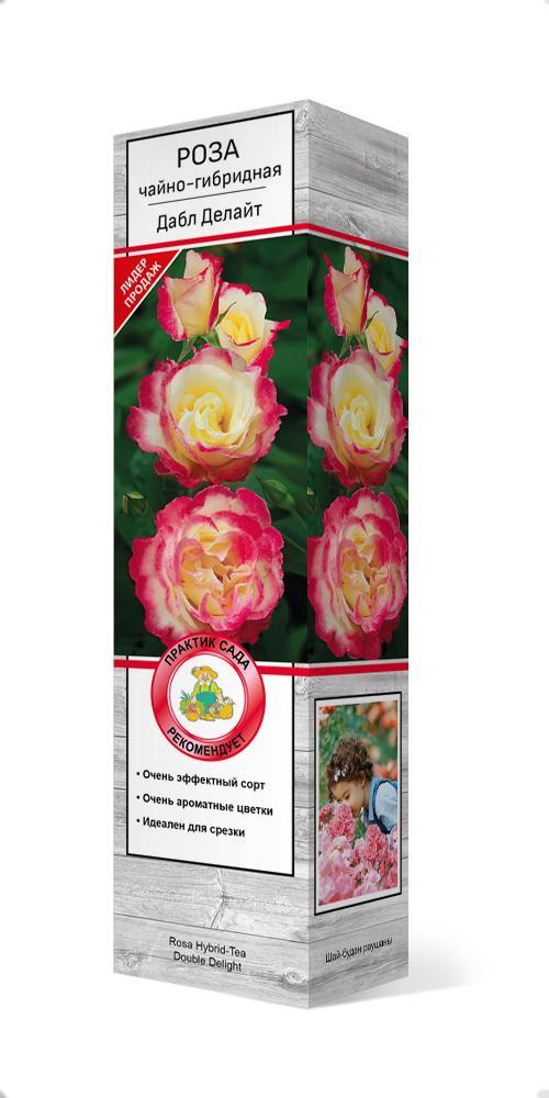Саженцы розы чайно-гибридной Дабл Делайт нравятся садоводам из-за красоты кустарника во время цветения и его неприхотливости в уходе. Взрослое растение вырастают до одного метра в высоту. Летом начинается пышное цветение бутонов, средний диаметр цветка составляет 12 см., лепестки с бархатной структурой и неравномерной бело-бордовой окраской. Непрерывное цветение до самой осени будет сопровождаться тонким и приятным ароматом, который не оставит никого равнодушным. Высаживать нужно на хорошо освещенном месте в плодородную и удобренную землю. Данный сорт роз морозостойкий.
