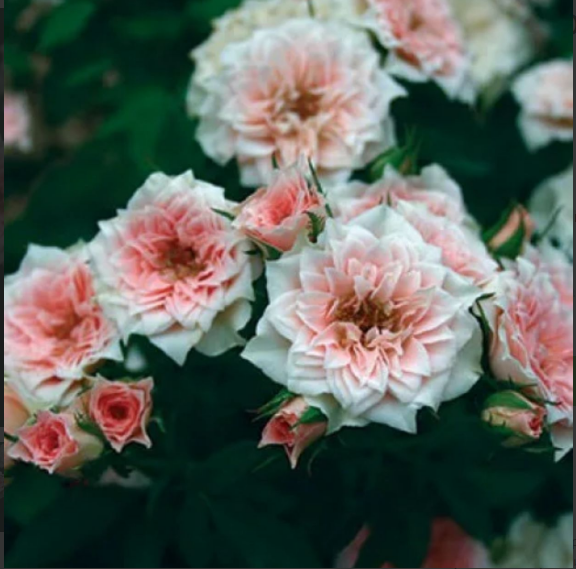 Куст вырастает миниатюрным, высотой до 30 см. Побеги прочные и ровные. Листья кожистые, густые, светло-зеленой окраски. Листовая пластина имеет красивый глянец. Бутоны заостренной формы. Постепенно они превращаются в густомахровые (55 – 60 лепестков), светло-розовые цветки. В каждом соцветии насчитывается до 20 бутонов. Лепестки слегка выгорают на солнце, но белыми не становятся. Цветение продолжительное и непрерывное (длится весь сезон). Аромат нежный и ненавязчивый.