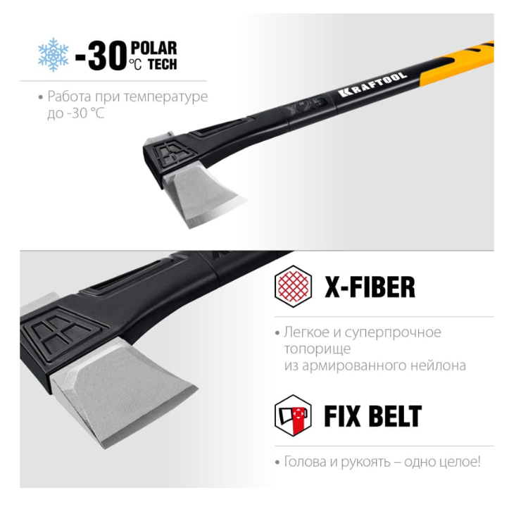 Лезвие имеет двойную закалку токами высокой частоты для оптимальной твердости. Выпуклый клин обеспечивает эффективность в работе и легкое извлечение из бревна. Рукоятка выполнена из армированного нейлона X-Fiber - это инновационный материал, прочный как металл, но при этом имеет малый вес.