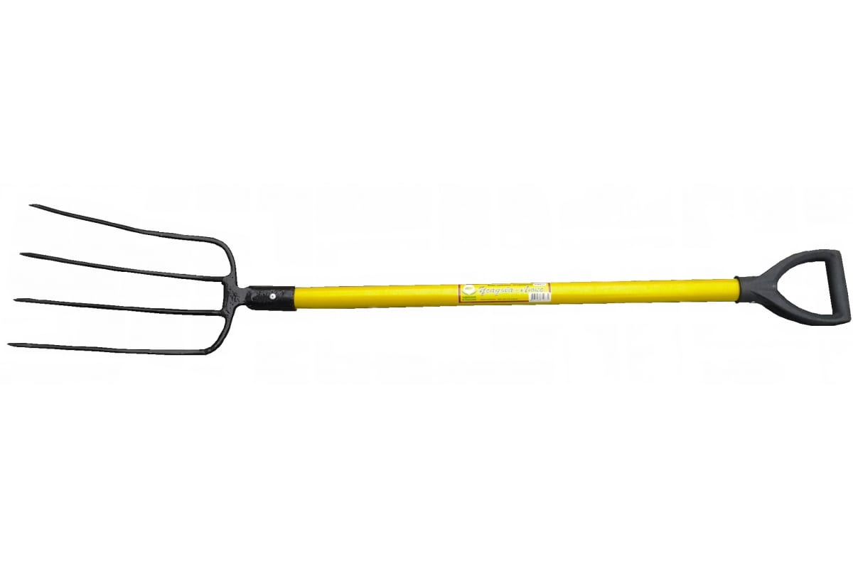 Вилы (4-х рогие, навозные, с желтым металлическим черенком, V-ручкой) Усадьба-Люкс представляют собой удобный инструмент из высококачественной стали. Изделие применяется для ворошения сена и соломы, а также других садовых работ.