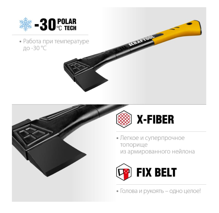 Топорище выполнено из армированного нейлона X-Fiber - инновационный материал, прочный как металл, но при этом имеет малый вес. Кованая голова из углеродистой стали и рукоятка надежно соединены в одно целое, что исключает выпадение лезвия.