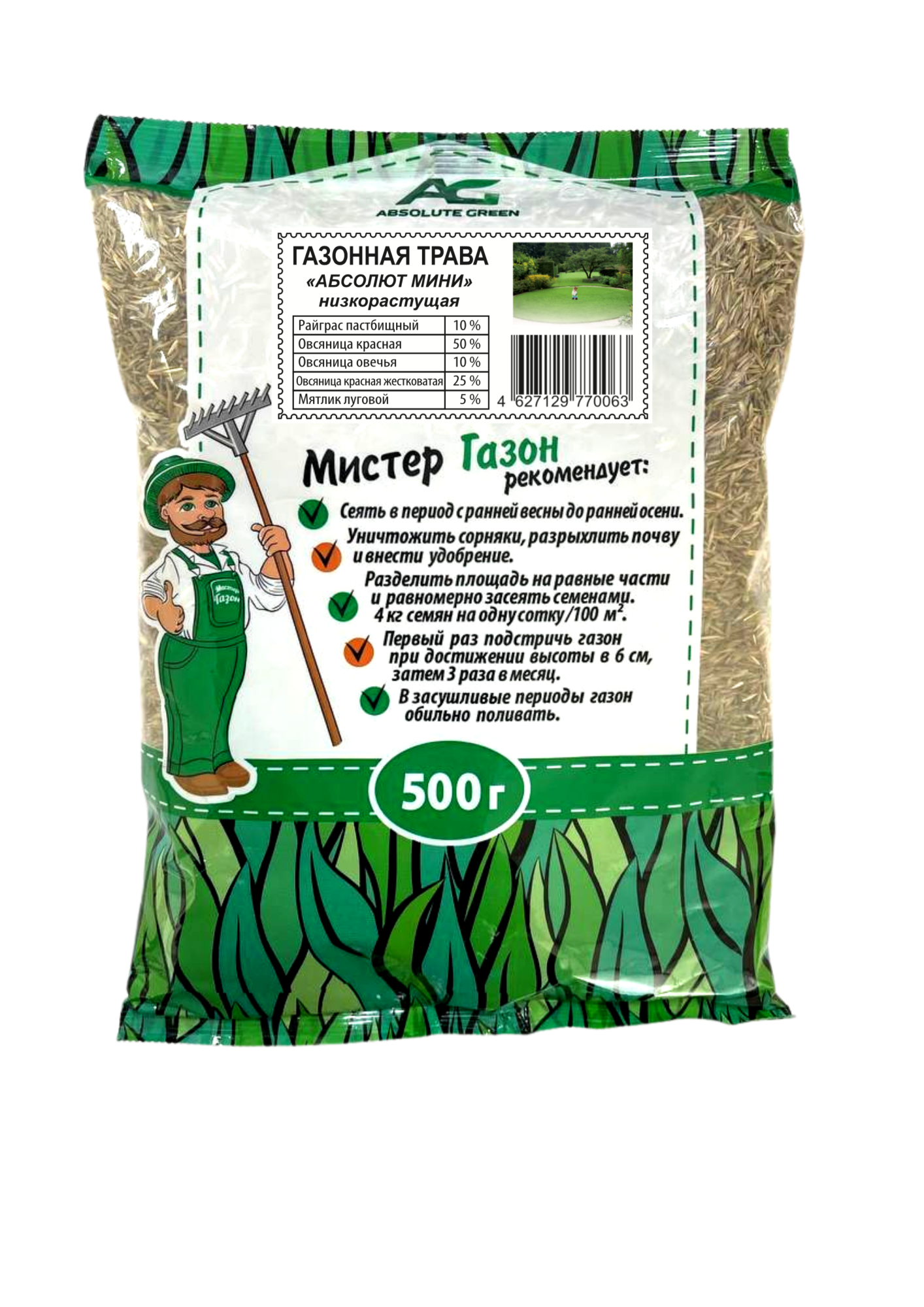 Газонная травосмесь ABSOLUTE GREEN Абсолют Мини 500 г 00000000468 адаптирована для редкого скашивания за счет смеси разных сортов овсяницы, из которых овсяница красная обладает наиболее медленным ростом. Добавление райграса пастбищного делает газон выносливым к вытаптыванию, а присутствие мятлика лугового придаст мягкость и повышенные декоративные свойства газону. Частота скашивания в 1.5 раза реже. Норма высева 4-5 кг на 100 м2.
