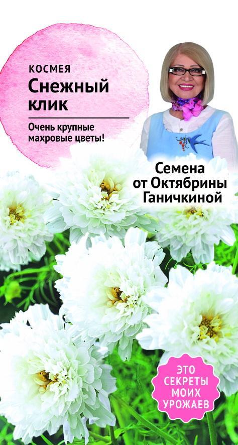 Семена ОКТЯБРИНА ГАНИЧКИНА Космея Снежный клик 0.1 г 119253 применяются для выращивания на частном участке. Однолетнее растение, высотой больше 80 см. Формирует мощный, сильноветвистый куст украшенный множеством соцветий. Соцветия очень крупные, махровые, снежно-белые, диаметром до 12 см. Цветение обильное и продолжительное. Смесь великолепно подходит для срезки и групповых посадок на цветниках и рабатках. Космея - неприхотливая культура, произрастает на любых типах почв, предпочитает солнечное местоположение. Посев производят в начале мая непосредственно в открытый грунт. Всходы появляются на 8-14 день. Цветет обильно с середины июня по сентябрь. Прекрасно размножается самосевом.