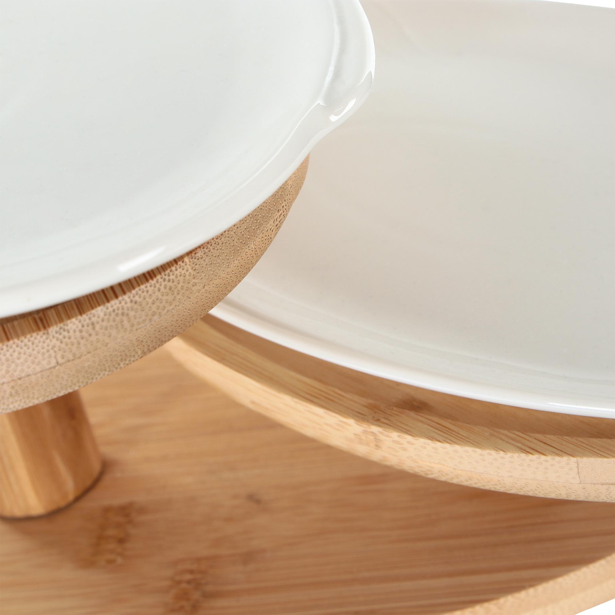 Блюдо-этажерка, фруктовница 2 яруса. Изготовлена этажерка из бамбука и фарфора. Элегантная конфетница сочетает в себе изысканный дизайн с максимальной функциональность, предназначена для красивой сервировки конфет, фруктов и десертов.Стойка-держатель украсит сервировку вашего стола и подчеркнет прекрасный вкус хозяина,