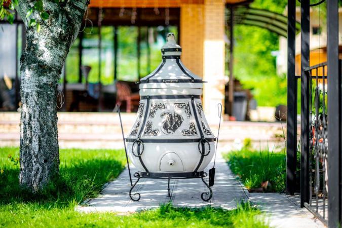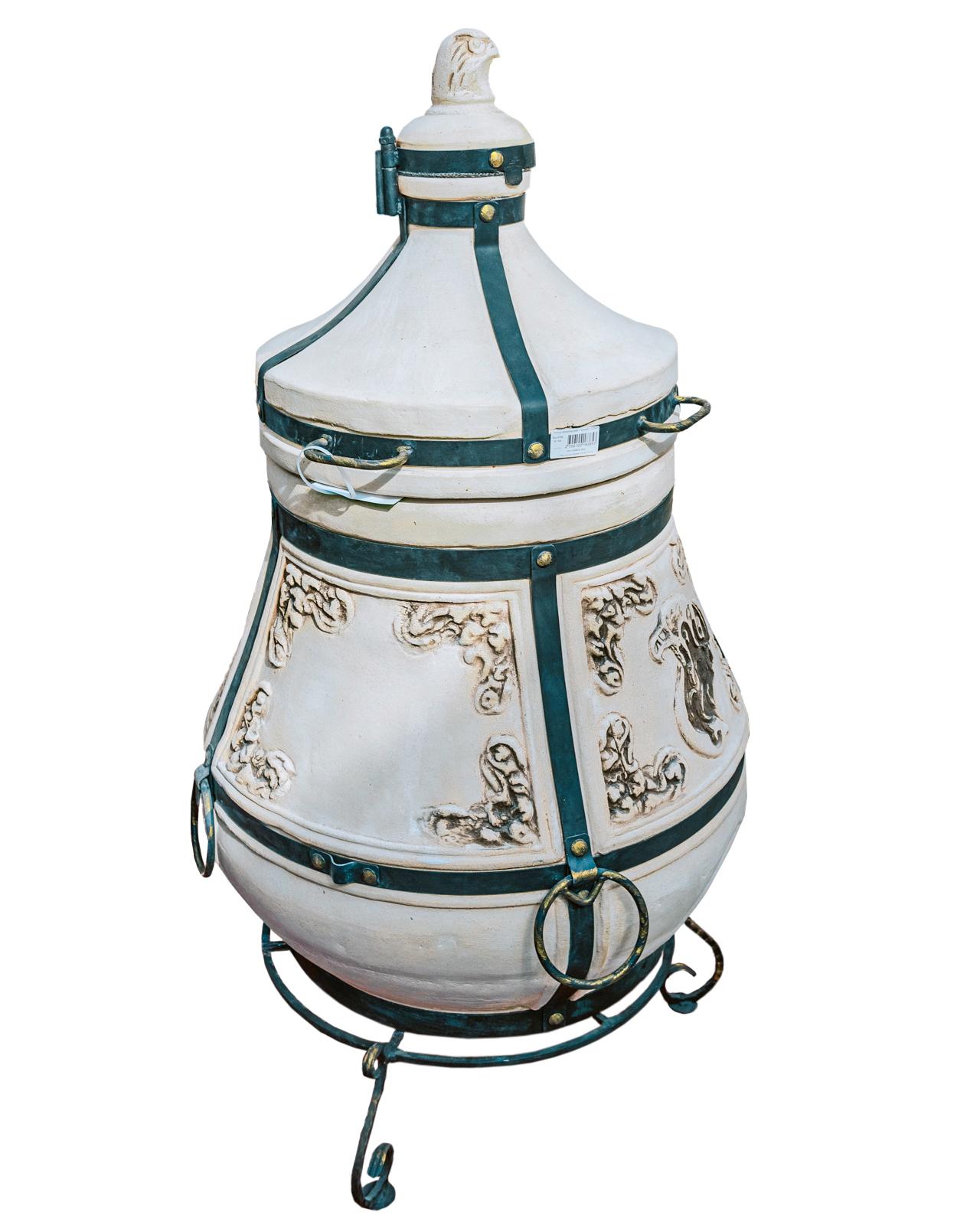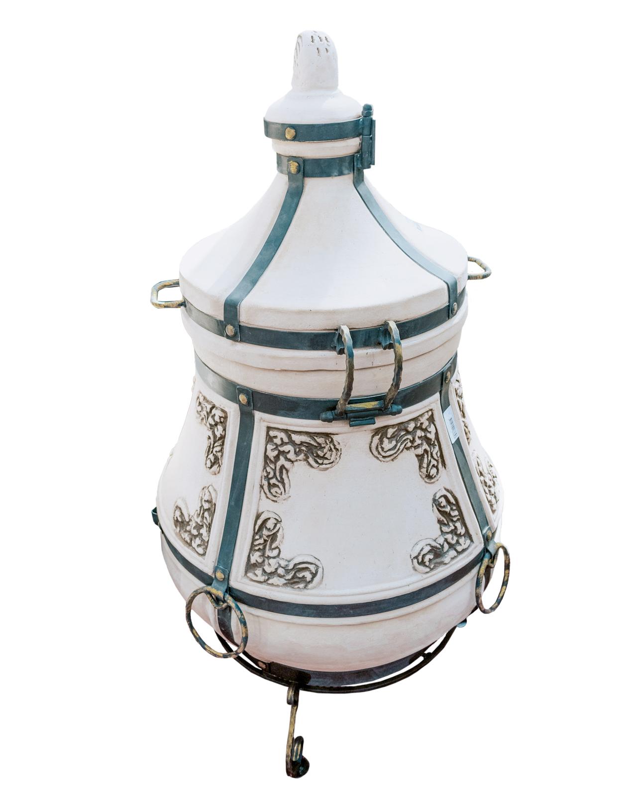 Тандыр из шамотной глины «Степной» отлично держит тепло, благодаря чему у всей пищи, приготовленной в нем, получается особенный вкус. Керамический тандыр идеально подойдет для приготовления сочной, вкусной и полезной пищи, а также в качестве подарка. Эта керамическая печь, которая в разогретом состоянии держит тепло в течение 2-4 часов. Большой объём тандыра и его толстые стенки дают возможность приготовить за один розжиг до 5 кг. Благодаря большой и удобной горловине возможно размещение большого количества мяса и овощей внутри тандыра (от 10 до 15 шампуров). Увеличенное дно тандыра позволяет заложить больше дров, что дает больше тепла. Имея плотно прилегающую крышку и толстые стенки, тандыр длительное время поддерживает высокую температуру, что позволяет более равномерно прожаривать даже самые крупные куски мяса (свиная рулька и баранья нога). Высота в собранном виде: 105 см, без колпака: 67 см, диаметр: 68 см. Вес тандыра 160кг.