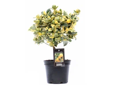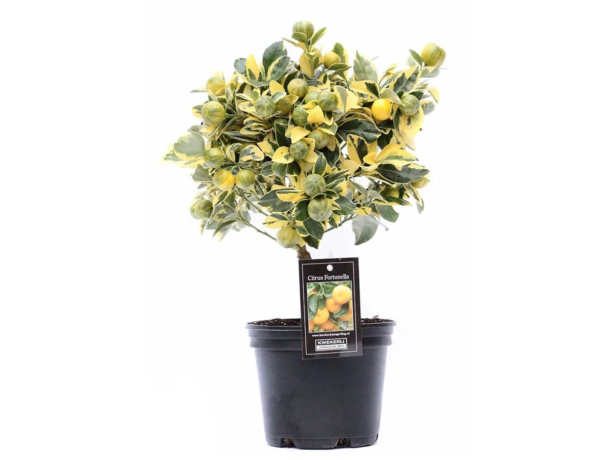 Цитрофортунелла Вариегата - гибридное деревце, которое отличается красивой вариегатной окраской,полосатыми плодами, небольшим периодом покоя, привлекательным внешним видом. Глянцевые листовые пластины насыщено - зеленого цвета с красивыми ванильными вариегатными пятнами. Плоды окрашены в светло - лимонный цвет с продольными зелеными прерывистыми полосами.