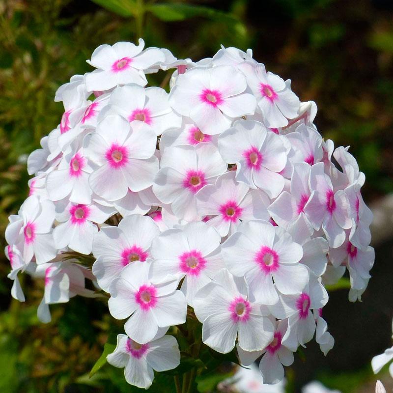 Флокс метельчатый Граф Цеппелин - травянистое многолетнее растение. Стебли прямостоячие, восходящие или ползучие, от 10-20 см до 120-150 см высотой. Листья цельнокрайные, сидячие, расположены супротивно, иногда в верхней части стебля — в очередном порядке, ланцетные, овально-ланцетные, яйцевидно-удлиненные. Цветки душистые, белые, розовые, красные, сиреневые, алые, голубые, карминовые с глазком в центре, 2,5-4 см в диаметре, обычно собраны в щитковидные или метельчатые соцветия различного строения и величины, реже одиночные. Цветение июнь-сентябрь. Граф Цеппелин: высота куста до 110 см. Стебли прямостоячие. Соцветие рыхлое, плоское, сильно разветвленное, размером до 18 см. Цветок крупный, до 4 см, белый с красным глазком. Цветет с 15 - 20 июля, в течение 28 - 30 дней. Устойчив к грибным болезням.
