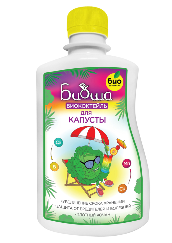 Биококтейль содержит полный набор легко усваиваемых растением витаминов и микроэлементов в биодоступной форме, с учётом повышенной потребности капусты в КАЛЬЦИИ (Ca) и БОРЕ (В), МАРГАНЦЕ (Mn) и МЕДИ (Cu).