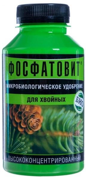 Фосфатофит - оригинальное микробиологическое удобрение, обеспечивающее растения основными элементами питания. Применяется в экологическом земледелии. Успешно используется как на открытом грунте, так и в теплицах. Микробиологическое натуральное удобрение на основе живых почвенных бактерий. Применение Фосфатовита запускает биологический механизм эффективной помощи хвойным растениям. В результате применения препарата улучшается корневая система растений, сохраняются и поддерживаются декоративные качества растений (насыщенный цвет хвои, пышная форма кроны), повышается устойчивость растений к неблагоприятным погодным условиям и заболеваниям, регулируется кислотность почвы для выращивания хвойных растений.