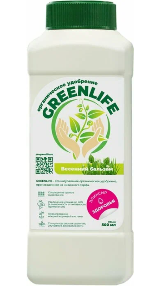 Натуральное органическое удобрение, произведенное из низинного торфа, действующим веществом которого являются фульво- и гуминовые кислоты. Применение Green Life обеспечивает: формирование мощной корневой системы, стимулирования роста и цветения. Сокращение сроков вызревания. Увеличение урожая до 40%. Формирование мощной корневой системы. Стимулятор роста и цветения, улучшение декоративности. Данное удобрение является концентратом. Для получения рабочего раствора необходимо развести 1 чайную ложку концентрата на литр воды. Бутылочки 500 мл хватает на 200 литров воды. Подкормки проводят путем полива или опрыскивания растения раствором Green Life всеми видами и системами поливов (традиционный, капельный, орошение и др.) при помощи леек, ранцевых, аккумуляторных, бензиновых опрыскивателей и другого садового инвентаря.