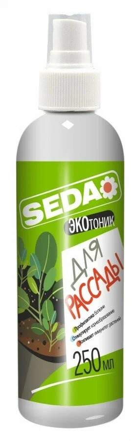Удобрение для рассады SEDA "ЭКОтоник для рассады", 250 мл - препарат для опрыскивания листьев овощных, декоративных, зеленых культур в рассадный период. Назначение: Стимуляция активного роста и адаптация молодых растений. Профилактика грибковых, вирусных и бактериальных заболеваний. Снятие стресса от негативных воздействий окружающей среды. Улучшение корнеобразования и приживаемости. Способ применения: Не требует разведения! Перед использованием встряхнуть флакон, равномерно распылить на листья до полного смачивания. Повторную обработку можно проводить через 7-10 дней. Состав: водный раствор геля хитозана на основе молочной кислоты (0,45 г/л).