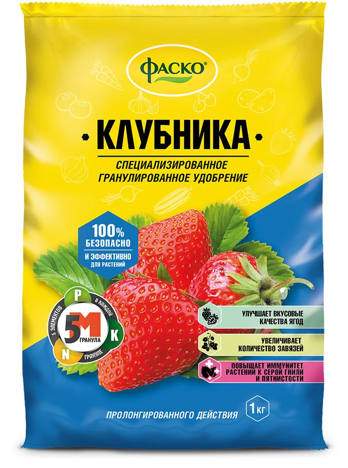Удобрение сухое Фаско 5М минеральное для Клубники гранулированное – минеральное удобрение комплексного действия. Содержит необходимый сбалансированный набор питательных веществ, который благоприятно влияет на рост и развитие растений, укрепляет иммунитет. Сформировано в гранулу, что ускоряет процесс внесения в почву. В каждой грануле содержится 5 питательных макро и микроэлементов. Что обеспечивает полноценное питание растений.Вид товара: удобрение;Объем: 1 кг; Применение: для выращивания клубники.