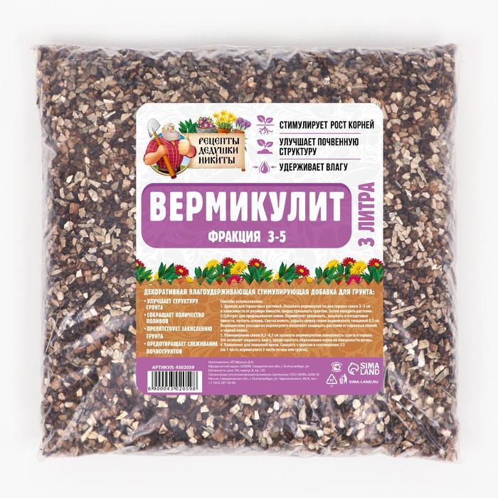 Вермикулит Рецепты Дедушки Никиты фр 3-5, 3л. Декоративная, аэрирующая, влагоудерживающая добавка для почвогрунтов. А также, Вермикулит используется в качестве кормовой добавки для крупного рогатого скота и птицы, за счет чего снижается заболеваемость кишечника, улучшается выведение токсинов из организма. Повышается содержание гемоглобина; количество эритроцитов; уровень белка, кальция и фосфата.