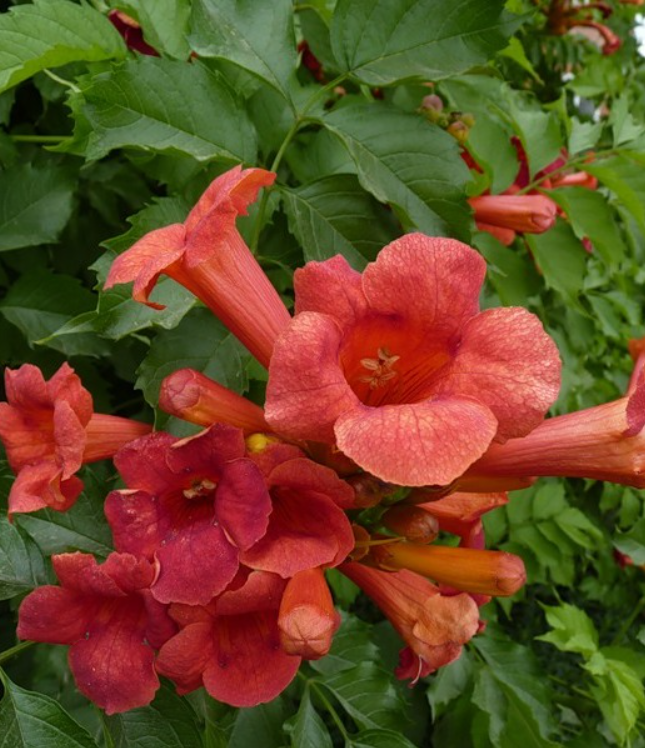 Сильнорослая лиана с декоративными трубчатыми крупными ярко-красными цветкаи в июле - сентябре. Лучше цветёт в тёплых солнечных местах, защищённых. Карабкается при помощи цепляющихся корешков, но в молодости нуждается в подвязывании. Молодые побеги зеленые, после одревеснения светло-коричневые. Начинает вегетацию весной, что позволяет молодым побегам меньше повреждаться заморозками. В конце мая начинается интенсивный рост и до начала июня образуется буйная масса.Подходит для посадки у различных опор, напр. у беседок, пергол.Особенно хорош для покрытия стен и мощных опор. Зимостойкость средняя до-26.Требует укрытия на зиму .
