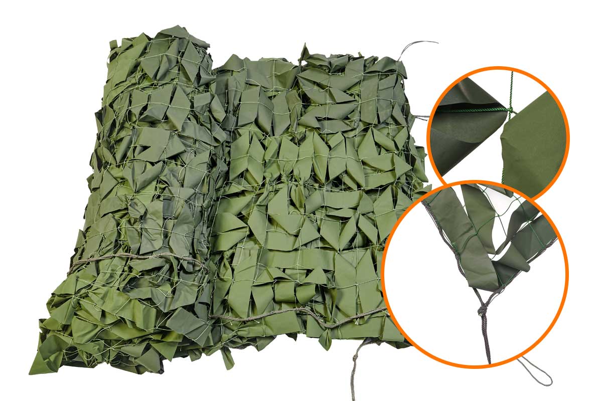 Маскировочные сети - долговечное укрытие многоцелевого использования. С их помощью можно скрыть объекты любой формы и объема, а также защитить от неблагоприятных воздействий окружающей среды. Сетка камуфляжная изготавливается на основе капроновой сети, с размером ячеек 50х50 мм, в них вплетены полимерные ленты светло-зеленого и темно-зеленого цветов. По периметру выполнена окантовка из полиамидного шнура диаметром 6 мм с петлями для удобного крепления. Преимущество сетки: не портится от влаги, горюче-смазочных материалов и моющих средств; самозатухающий материал покрытия: при удалении пламени прекращает гореть без остаточного тления; можно использовать при температуре от – 40 до + 40 °С. Данные маскировочные сети отвечают всем военным стандартам.